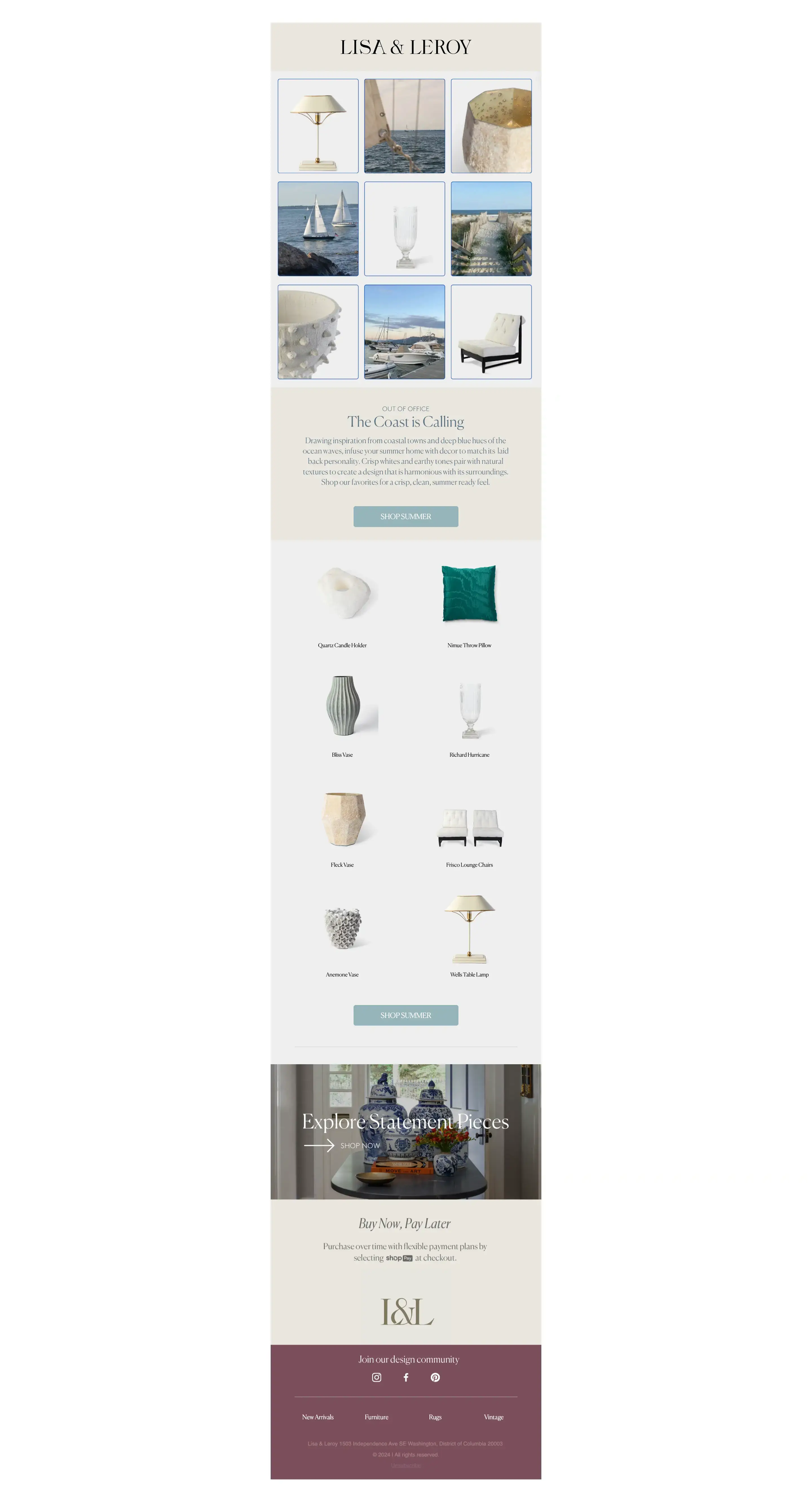 Lisa & LeroyEmail Welcome Flow Redesign & Weekly Campaigns for an Upscale Home Decor and Interior Design Brand.